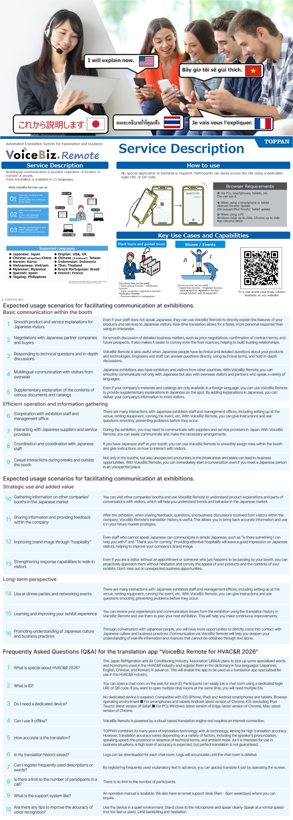 VoiceBiz Remote is a multilingual AI translation service for explanations and guidance developed by TOPPAN Corporation.